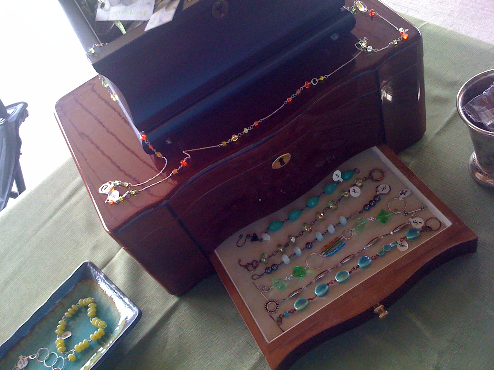 I started out with the jewelry trees on the right side of the table and the jewelry boxes on the left, but the necklaces wanted to blow off the end of the table and the lid kept blowing closed on the black box, so I switched them around. That arrangement worked out better, except that the frame for my new little credit card sign kept blowing over and the necklaces kept blowing into a tangle.